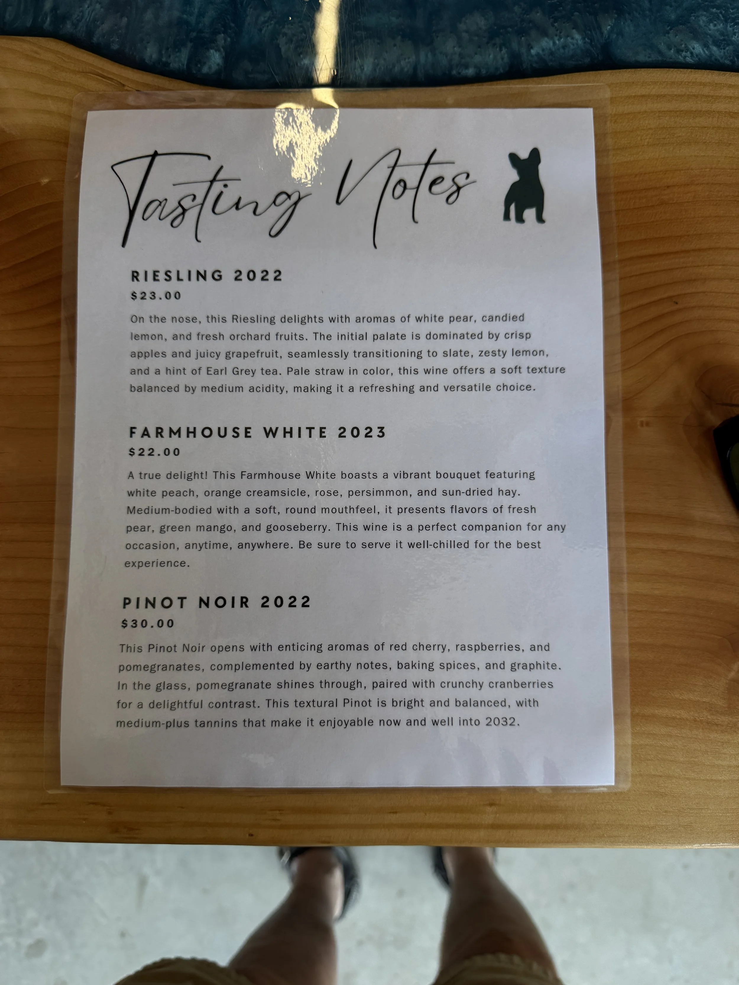 Finally we tried the 2022 Pinot Noir ($30). The grapes for this wine come from East Kelowna and Naramata. This was a nice, light Pinot that had some nice fruitiness but also had some earthiness in the background. Alicia said that you can age this wine for 10 years. Pretty nice considering this is a new winery!